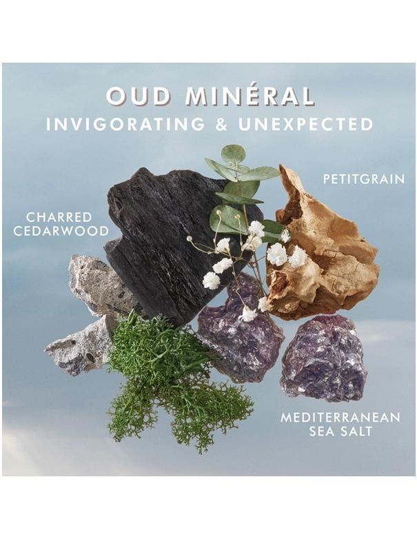 Oud Minéral – Revigorant et inattendu. Sel de mer méditerranéen et bois de cèdre carbonisé.