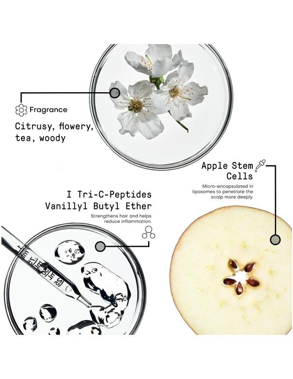 - Tri-C-PeptidesTM : Augmente la circulation sanguine vers les follicules pileux pour leur apporter les nutriments essentiels / Renforce les cheveux en favorisant la production de collagène et d'élastine pour prévenir la casse et les pointes fourchues / Protège les cheveux et le cuir chevelu des dommages environnementaux, tels que la pollution et les rayons UV