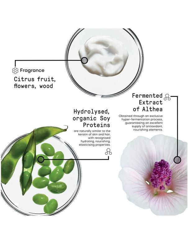 - Extrait fermenté d'Althea : Les acides aminés naturels renforcent les cheveux abîmés et fragiles et traitent les cheveux secs et cassants en réparant et en fournissant des niveaux d'hydratation sains dans les cheveux / Apaise un cuir chevelu facilement irrité en fournissant un film protecteur sur les cheveux / Démêle, hydrate et protège les cheveux