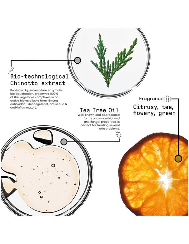 Ce shampooing doux enrichi en extrait de chinotto, huile d'arbre à thé, piroctone olamine, climbazole, zinc-PCA et acide salicylique nettoie et apaise le cuir chevelu en douceur tout en prévenant et en combattant les pellicules. Il élimine et combat la réapparition des micro-organismes responsables de la sécheresse du cuir chevelu et/ou des pellicules, soulageant rapidement les démangeaisons et laissant tous types de cheveux doux, faciles à coiffer et revitalisés. Ce rituel purifiant agit progressivement, faisant disparaître les squames et restaurant un cuir chevelu sec et élastique. Ses ingrédients antiseptiques, décongestionnants et hydratants améliorent visiblement l'état des cheveux.