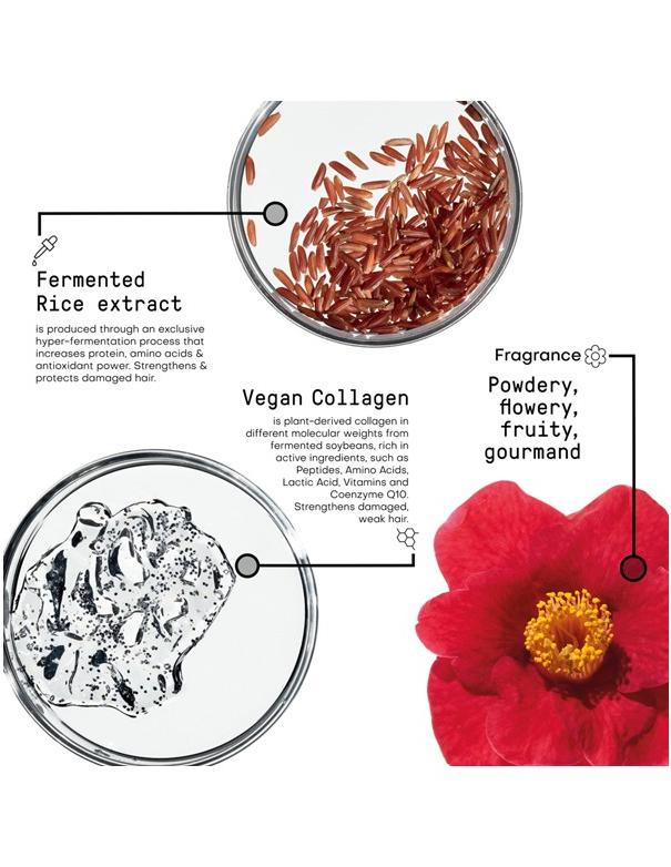 Enrichi en extrait de riz fermenté, en acide hyaluronique, en collagène vegan et en résine filmogène longue durée 100 % végétale, il renforce et répare les cheveux abîmés. Il les rend extrêmement doux, soyeux et brillants, avec un aspect rajeuni.